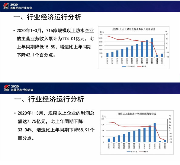 在會(huì)議現(xiàn)場(chǎng),中國(guó)建筑防水協(xié)會(huì)秘書(shū)長(zhǎng)朱冬青作出了關(guān)于《后疫情時(shí)期防水行業(yè)的挑戰(zhàn)和機(jī)遇》的主題演講,他從防水行業(yè)經(jīng)濟(jì)形勢(shì)分析、疫情對(duì)行業(yè)的影響分析和行業(yè)發(fā)展的挑戰(zhàn)與機(jī)遇等方面對(duì)主題演講進(jìn)行了專業(yè)解讀。朱冬青秘書(shū)長(zhǎng)在演講中表示,今年一季度,受疫情影響,防水行業(yè)迎來(lái)了前所未有的收入及利潤(rùn)雙下降,對(duì)行業(yè)發(fā)展帶來(lái)了不小的沖擊。